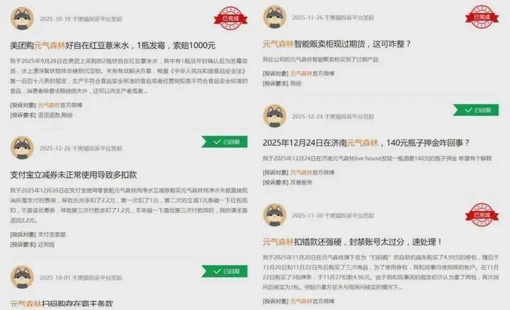 唐彬森一曲树立的是潜心打磨产物的人设,好比其长挂嘴边的“我们只做本人爱喝、情愿给家人喝的产物。”不外也应看到,正在黑猫赞扬等相关消费者的平台上,相关元气丛林的 各类索赔赞扬,已不正在少数。